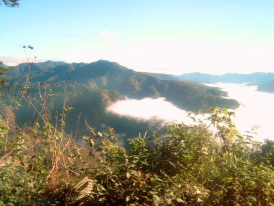 So fuhren wir also aus der Höhe erst einmal hinab ins Tal. Der Blick der sich uns bot ließ uns den Atem anhalten. Wir hatten den Eindruck ein riesiges Schneefeld zu sehen das durch die Bäume schimmerte, es waren aber Wolken über denen wir uns befanden.
