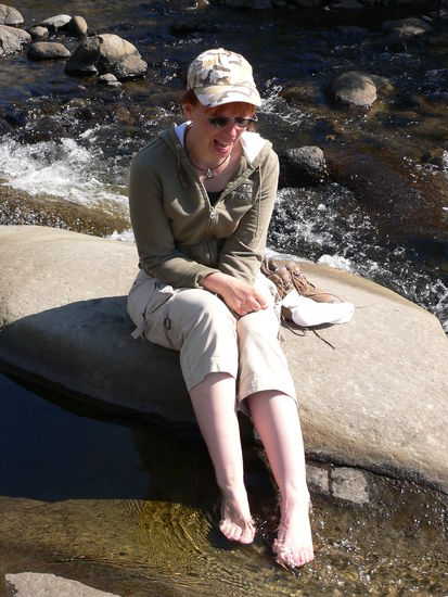 Danach liefen wir am Flusslauf entlang Richtung Camp. Zwischendurch gab es noch eine super Abkühlung im Fluss. Da froren einem ja die Zehen ein. Das Wasser war eiskalt und die Außentemperatur brachte einen zum Schwitzen - nannte man das Kneippkur?