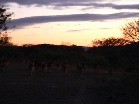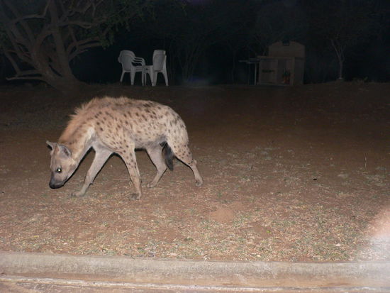 Um 22.00 Uhr (bis 8.00 Uhr morgens) wird in diesem Camp das Licht ausgeschaltet und man darf sich mit Kerzen oder der Taschenlampe fortbewegen. Wir waren schon ganz gespannt was passieren würde, da seit der Dämmerung die Impalas in unserem Garten grasten. Und siehe da - es bewegte sich etwas an unserem Grill. Eine Hyäne - die wollte wohl mal nach den Resten schauen und kam das wohl wegen des Blitzlichts auf unser Fenster zu. Ein bescheidenes Gefühl obwohl man genau weiß, dass Türen und Fenster geschlossen sind. Die Hyäne hat wohl alle Grills im Camp untersucht und tauchte noch drei Mal bei uns auf - einfach fantastisch.