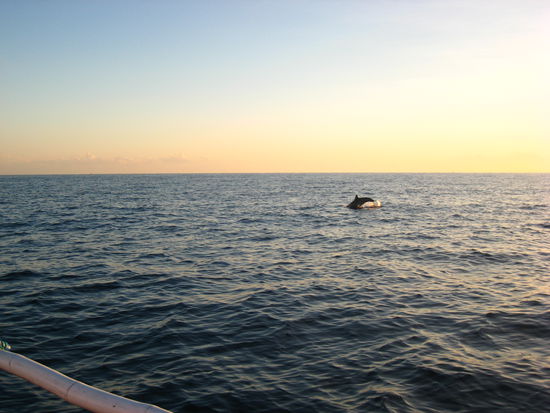 Noch vor Sonnenaufgang ging es um 6.00 Uhr mit dem kleinen Fischerboot hinaus auf´s Meer. Die See ist zu dieser Zeit noch sehr ruhig und da lassen sich die Delphine besser/leichter beobachten. Langsam wurden die ersten Sonnenstrahlen am Horizont sichbar, eine wunderschoene Stimmung. Und schon tauchten die ersten Schulen von Delphinen auf. Der Captain versuchte immer wieder diesen zu folgen, was natuerlich nur schwer moeglich war. Immer häufiger sah man Delphine verspielt aus dem Wasser springen - und dies noch dazu im Licht der aufgehenden Sonne.