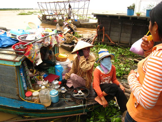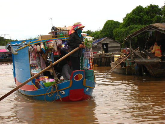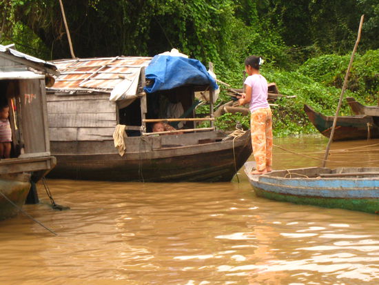 Mein Driver hat mich puenktlich um 9.30 Uhr abgeholt. Die Fahrt ging zuerst einmal zu den Floating Houses zum Tonle Sap Lake. Die "Strasse" fuehrt von Siem Reap weg, den Siem River entlang, dann geht es mit einem Boot weiter, die letzten Kilometer, bis der Fluss in den "Tole Sap Lake" mündet. Hier liegt wahrlich die ganze Infrastruktur eines Dorfes auf Hausbooten: Die "Wohnboote", die Schule(n), selbst der Turnsaal, die Werkstaetten. Alles spielt sich am Wasser ab. Die Floating Hoeses spannen sich bis zur Muendung des Siem Rivers in den "Tole Sap Lake". Von hier geht auch der Schiffsverkehr bis Phnom Penh, und weiter am Mekong River, bis nach Vietnam.