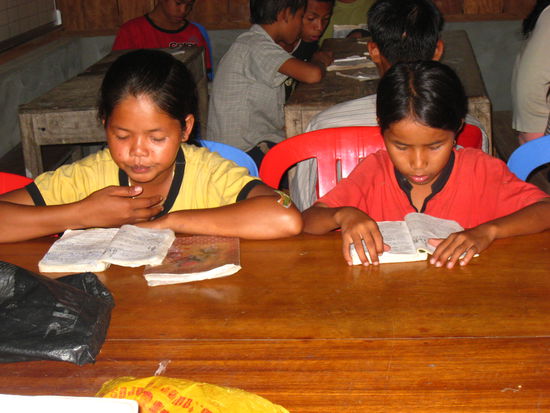 Um 18.30 sind ploetzlich etwa 25-30 Kinder mit ihren Fahraedern daher gekommen, zum Englisch Unterricht. Kim gibt taeglich ohne Bezahlung den Kindern aus der Umgebung Englisch Unterricht. Der Vorteil fuer ihn liegt darin, dass er dafuer selbst Englischbuecher vom Government erhaelt und sich dadurch weiterbilden kann. Die Kinder, Burschen und Maedchen zwischen 10 und 15 Jahren, waren sehr aufmerksam und interessiert, kein Vergleich mit einer Unterrichtsstunde bei uns in Oesterreich. In der Zwischenzeit ist es dunkel geworden und es musste aus der bereitgestellen Batterie "Licht" gemacht werden. Die Muecken sind auch eingefallen. Der Unterricht dauerte eine knappe Stunde, und war ein Erlebnis fuer mich.