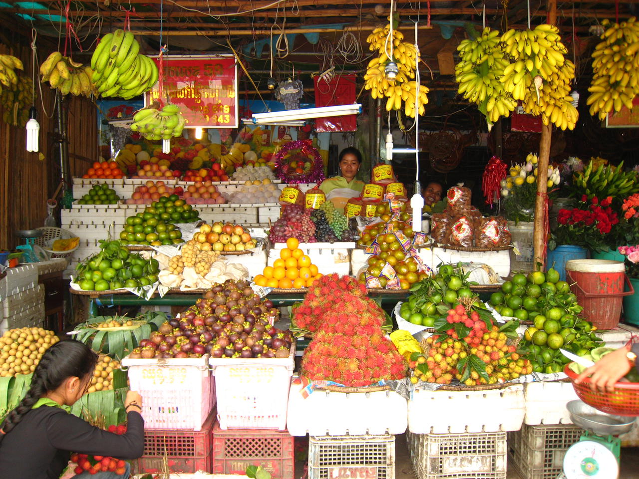 Weiter am aeusseren Rande der Markthalle werden Kleider und andere Strickwaren angeboten, und vor der Halle rund herum Blumen, Obst und Leckereien. Habe wieder einen gegrillten Oktopus verzehrt (mit spicy souce - die typische kambodschanische Kueche ist "scharf").