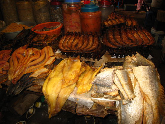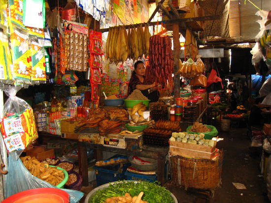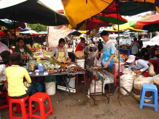 Wir fuhren stattdessen zum russischen Markt (Phsar Toul Tom Poung). Der Name kommt noch aus der Zeit des Kommunismus, wo enge Verbindung mit Russland, wie auch mit China und Vietnam bestand. Russische Marktwaren findet man jetzt hier nicht mehr vor! Fuer mich waren der Food-Market und die Garkuechen am beeindruckendsten - der Appetit ist mir aber schon vorher vergangen!