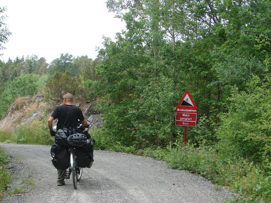 Da mussten wir feststellen, dass der Verkaeufer vom Fahrradgeschaeft in Stroemstad recht hatte, dass Andreas keinen Speichenbruch haben wird, dafuer lockerten sich nach und nach die Schrauben bei den Speichen und er bekam immer mehr und mehr einen Achter ins Laufrad. Und so begann der Stress wieder von vorn. Auf gings in die naechste Stadt (Sandefjord), auf die Suche nach einem Fahrradgeschaeft. Dort meinten sie, sie koenne es zwar reparieren, aber sehr weit kommt man damit auch nicht. Als einzige Loesung gabe es nur ein neues Laufrad von ihnen, dass garantiert halten sollte. Etwas skeptisch liessen wir uns ueberreden. Ein mulmiges Gefuehl im Bauch, dass wir fuer etwas zahlen, was wieder nicht den Versprechungen haelt, da wir ja bereits mit dem 1. Radgeschaeft schlechte Erfahrungen gemacht haben. Aber es blieb uns ja keine andere Wahl, die Tour muss weitergehen.
