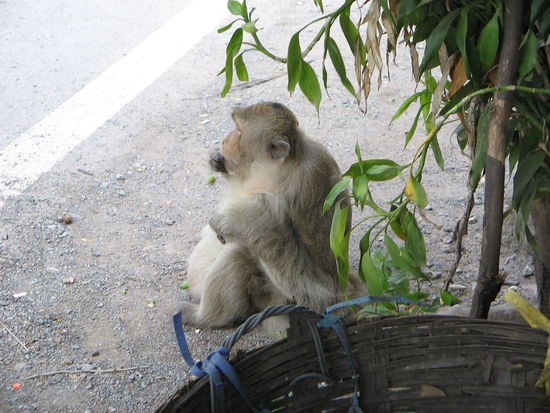 Im Nachmittag fuhren P'Aun, die Schwedinnen und noch zwei Angestellte von Greenway (P'Mick und P'Orr) nach Lopburi. Unterwegs gabelten wir einen Amerikaner namens Brian auf. Der Typ ist echt SUPER! In der Nähe mehrerer "Sehenswürdigkeiten" warfen uns die Anderen aus dem Auto, P'Aun, die Schwedinnen (Gott, dass ich mir NIE Namen merken kann!) und mich. Die "Sehenswürdigkeiten" sind keine Kirchen, Monumente oder was man normalerweise sonst unter dem Begriff versteht, sondern Orte, an denen sich die Affen anscheinend besonders gerne aufhalten. Diese Gebiete sind zwar umzäunt, aber nicht vollständig - die Affen haben es aber trotzdem schön dort! ...Oder besser gesagt sie hätten es schön dort, wenn nicht die ganzen Touristen ihren Müll auf den Boden werfen würden.