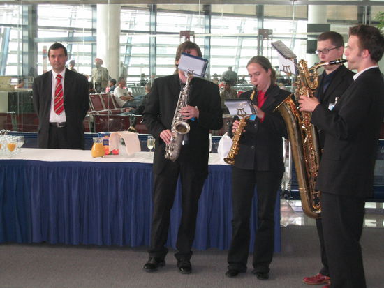 Musik einer Kapelle spielte auf und Getraenke wie Orangensaft, Sekt und Mineralwasser wurden angeboten.