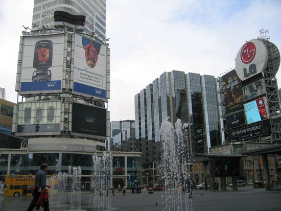 Der Yonge Dundas Square. Ein zentraler Treffpunkt der Stadt. Hier wird allwoechentlich irgend eine Veranstaltung abgehalten. Dazwischen sind die im Boden eingelassenen Springbrunnen Gaudium der Kinder und Jugendlichen.