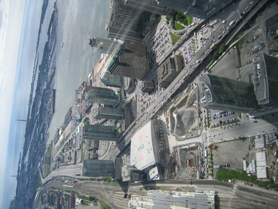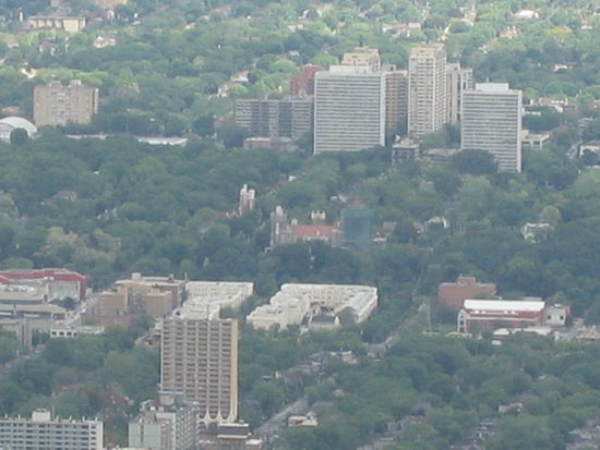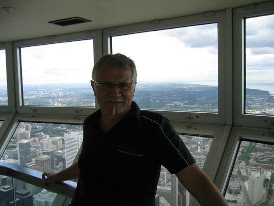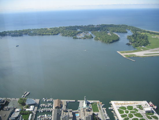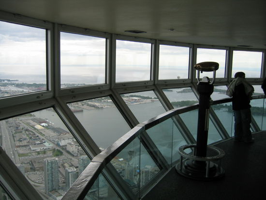 Die Sicht war ausgezeichnet. Man konnte vom Tower aus den Aussichtsturm und die Hochhaeuser von Niagara Falls sehen. Die Wegstrecke dorthin in fast einen Halbkreis ist so an die 150 km an der anderen Seite des Lake Orentario. Entschuldigung dafuer, die 12-fache Vergroesserung meiner Cam brachte nicht mehr, aber bei genauerem Hinsehen sind am Horizont tatsaechlich drei Erhebungen zu sehen!