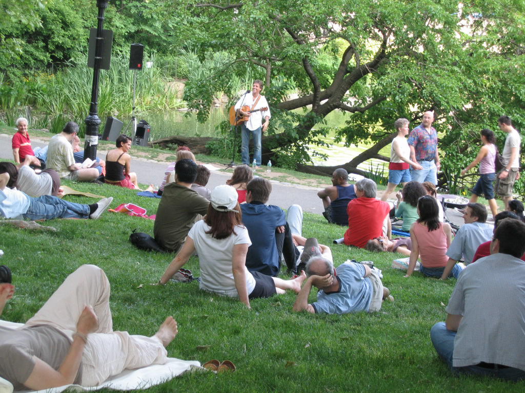 Hier im Park, der stark von der Bevoelkerung angenommen wird, auf einem Rasen, der fuer Hunde gesperrt ist. Es wird auch Kunst in Form von Baeumen aus Metall angeboten