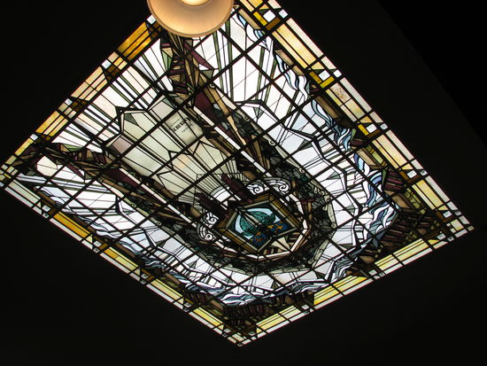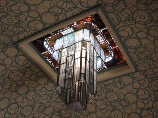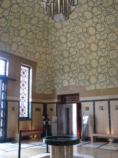 "Die Hauptfassade des 1928 eröffneten Baus ähnelt der eines kleinen griechischen Tempels. Raffiniertestes Art déco bietet dagegen das Vestibül hinter der mit abstrakten Mosaiken dekorierten Vorhalle. Die fast psychedelischen Muster der Kuppel mit ihren ineinander verschobenen Kreisen finden sich im schmiedeeisernen Portal wieder. Wie eine geometrische Glasblüte leitet eine Laterne das Oberlicht auf eine Brunnenschale aus grünem Marmor.