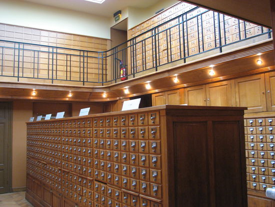 Zur Linken der von einer Galerie umlaufene kleine Katalogsaal, der mit seinen mannshohen Schubladenschränken etwas Kafkaesk-Klaustrophobisches hat.