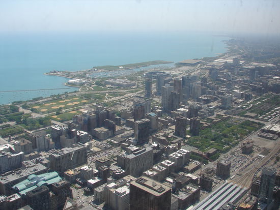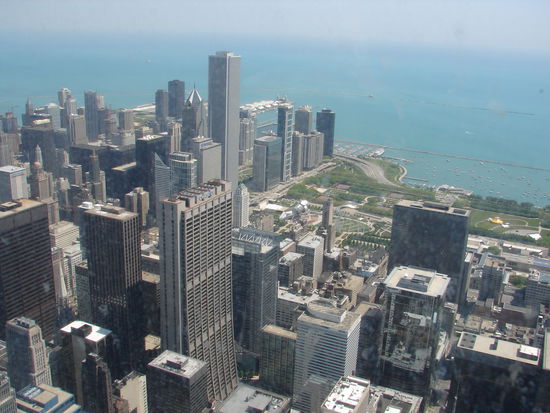 Als wir an diesem Morgen das HI Hostel auf dem Congress Parkway verließen, bekamen wir fast einen Schlag. An diesem Morgen betrug die Temperatur schon fast 30°C. Gut gelaunt liefen wir zum Sears Tower, denn heute wollten wir uns mal Chicago vom höchsten Gebäude der USA aus ansehen. Zuerst machten wir aber noch eine Frühstückspause vor dem Sears Tower mit Donuts von Dunkin. Die Schlange vor dem Eingang zum Skydeck war recht kurz und so bekamen wir schon nach ein paar Minuten unsere Eintrittskarte und konnten uns im Kino die Entstehungsgeschichte des Sears towers anschauen. Nach dem kurzen Film gingen wir noch durch eine Art kleines Museum um danach mit dem Aufzug in den 110. Stock zu fahren, dem Skydeck. Die Aussicht vom Skydeck aus ist wirklich fantastisch. Vorallem hatten wir an diesem Tag schönes Wetter und konnten relativ weit sehen.