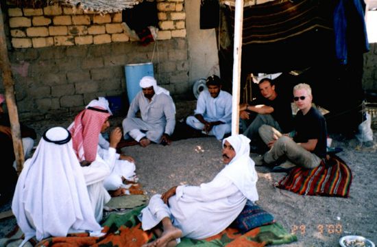 Mio wird derweils von einem Beduinen abgeschleppt, der uns dann auch gleich zu sich nach Hause auf Tee einlädt. Dort gibt es nicht nur Tee, viele Freunde und die Familie des Beduinen, sondern auch eine Runde bestes Leitungswasser, dargereicht in einem großen Becher, aus dem alle abwechselnd trinken. Und das, obwohl wir eigentlich immer nur Wasser aus Flaschen trinken wollten.