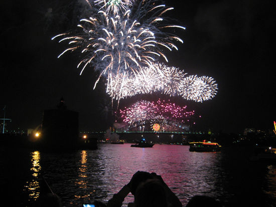 Hier quartierten wir uns im Down Town in der nähe des Darling Harbour in einem völlig überteuerten Hotel ein, um die Neujahrstage hier zu verbringen. Nebenbei bemerkt, zu dieser Zeit sind sämtliche Hotels in Sydney überteuert, da die Preise gegenüber den normalen Preisen um ca. 300% aufschlagen. Aber die Besucher bezahlen die Preise und so kommt es einem vor, als ob die Stadt aus allen Nähten platzt. Touristen wo man hinschaut. Aber das Wetter stimmt und so macht es Spass die Stadt zusammen mit hunderttausenden anderen zu erkunden und zu geniessen. Da wir uns schon vorher über die Neujahrsfestivitäten übers Internet informiert haben, gelangten wir bereits zur Überzeugung, dass das berühmte Neujahrsfeuerwerk am besten auf einem Schiff in der Bucht von Sydney anzusehen wäre. Das Ganze hat nur einen Haken. Die billigsten Plätze auf einem offiziellen Schiff, welches sich in der Exclusion Zone der Bucht während des Feuerwerks aufhalten darf, kosten 200.-- (ohne Verpflegung). Wenn man noch etwas zu Essen haben möchte, ist man sehr schnell bei einem Ticketpreis von 600.-- bis 1'000.-- pro Person. Als wir uns am Morgen des 31.12. zum Frühstück begaben, hatten wir uns schon mehr oder weniger damit abgefunden, dass wir zusammen mit einigen Millionen anderen Besuchern das Feuerwerk irgendwo vom Festland aus betrachten würden. Gewissermassen kam uns jedoch der Zufall zu Hilfe. Als wir nämlich so gemütlich beim Frühstück sitzen, grinst plötzlich jemand vom Eingang her zu uns rüber mit der Aeusserung "das gibt's ja gar nicht" auf den Lippen. Man glaubt es kaum, aber dort stehen wieder Monika und Simon und lachen uns an. Die haben doch tatsächlich das gleiche Hotel für Neujahr in Sydney gebucht wie wir. Wir besuchen zusammen den Sydney Tower und verabschieden uns dann, wobei uns die beiden noch empfahlen, heute doch nochmals bei den Tour Büros vorbeizuschauen, obs nicht noch günstige Last Minute Tickets für das Silvesterfeuerwerk gebe. Gesagt, getan. Wir klappern verschiedene Büros ab, jedoch überall "Fully booked" oder Tickets für 1'000.-- oder ähnliches. Als wir kurz darauf an einem Stand eines Dinnercruise-Veranstalters vorbei laufen, fragt uns dieser, ob wir noch ein Ticket für den New Years Eve suchen würden. Eine kurze Diskussion ergibt, dass der Veranstalter soeben eine Cancellation von drei Gästen erhielt und deshalb noch entsprechende Tickets für 450.-- pro Person (all inclusive) zu vergeben hat. Das ist zwar im Normalfall ein unglaublich teures Ticket, aber nach dem was wir alles gesehen haben erscheint es uns bereits als Schnäppchenpreis. Nach kurzer Ueberlegung entschliessen wir uns dieses Geld zum Fenster rauszuwerfen und somit den Silvesterabend definitiv auf einem Schiff zu verbringen. Und wir haben es nicht bereut! Das Spektakel vom Wasser aus zu sehen war einfach fantastisch. Die ganze Stadt wurde ins Mitternachtsfeuerwerk miteinbezogen. Sogar aus den Hochhäusern schossen Raketen in den Himmel und die Harbour Bridge schien in Flammen aufzugehen. Zudem wurden an verschiedenen Orten im Wasser ebenfalls Feuerwerke gezündet, so dass man fast nicht wusste wohin man schauen soll. Unbeschreiblich!