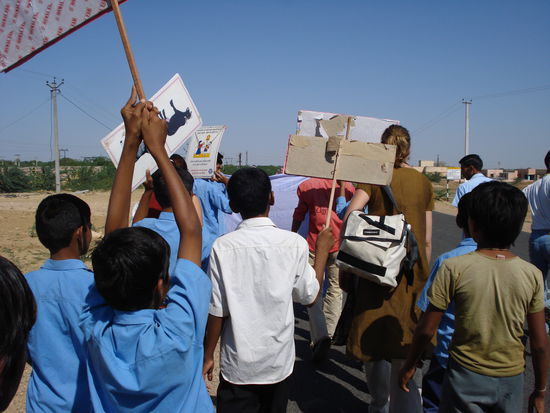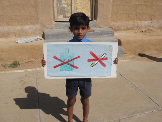Viele Kinder hier in der Gegend haben bereits braune Zaehne weil sie Kautabak konsumieren - d.h. bereits in so jungen Jahren Tabakabhaenging sind! Dazu kommt, dass viele ihrer Eltern ein Alkoholproblem haben und die Kinder dies zu spueren bekommen. Dies war der Ansporn fuer unsere Staff und einige Lehrer aus Shiv, eine Anti Tabak und Alkohol Demo zu veranstalten und wir Volunteers haben dazu Plakate und Banner gebastelt. Um ca. 10 Uhr sind wir mit vielen Schulkinder aus dem Ort durch das Dorf gezogen und die Kinder haben dazu Sprueche auf Hindi gerufen. Es war eine sehr spezielle Erfahrung und meiner Meinung nach eine gute Sache. Ich hoffe, dass einige ins Gruebeln gekommen sind.