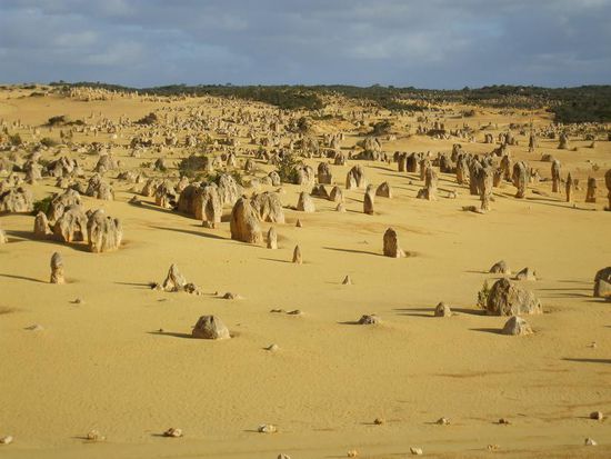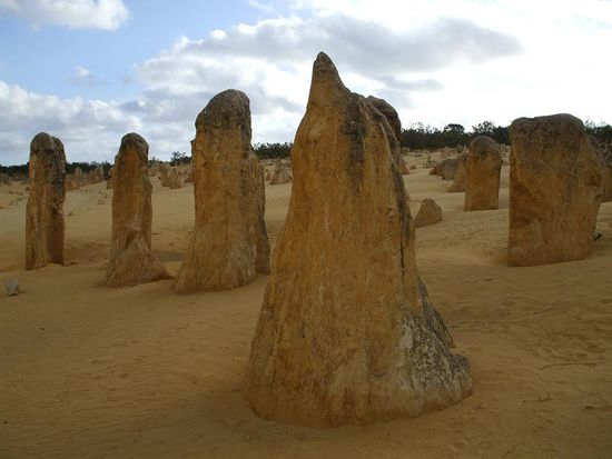 Im Norden von Perth sind die Pinnacles - verwitterte, bis zu 4m hohe Kalksteinsaeulen - die sich ueber einige Quadratkilometer verstreut auftuermen. Man kann einfach zwischendurch mit dem Auto durchfahren und ab und zu stehen bleiben.