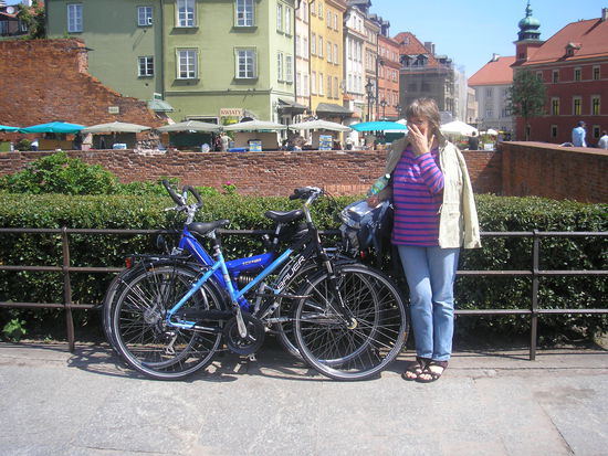 Nachdem wir die Fahrräder aus ihren Halterungen gelöst hatten, ging es auf den Bahnsteig hinab und von dort treppab, treppauf aus dem Bahnhof ins sonnige Warschau. Im Hotel konnten wir unser Gepäck deponieren und dann ging es mit den Fahrrädern in die Altstadt. Dort überließen wir die Räder - an einem Gitter angeschlossen - ihrem Schicksal und begaben uns per Pedes in die sehenswerte Altstadt.
