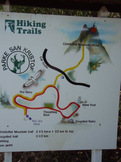 Nach einer Stunde Autofahrt sind wir im Christoffel National Park angekommen und erkundigen uns, wie wir am Besten den Berg von ca. 372m erklimmen. Nach der Entrichtung von 7,50 NAF für Interns machen wir uns auf den Weg.