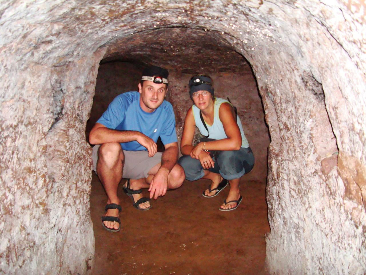 Am Ende der Tour besuchten wir noch das Tunnelsystem der Nordvietnamesen. Wow, das war mega Eindruecklich. Das Tunnelsystem hat drei verschiedene Stockwerke. Erstes Stockwerk 12 Meter tief, zweits Stockwerk 15 Meter und das Dritte sogar 23 Meter tief unter der Erde. Das ganze System wurde in nur 18 Monaten erbaut, kaum zu glauben. Ausgeruestet mit Stirnlampen gings dann runter in die Tunnel.