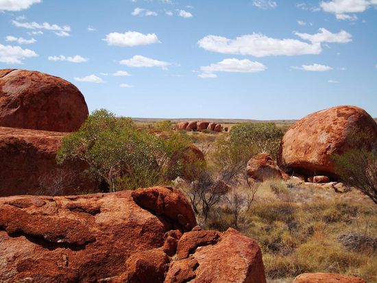 Unterwegs kamen wir noch bei den Devils Marbles vorbei. Riesige Steinformationen die im Laufe der Zeit freigelegt wurden. Wie aus dem Nichts ploetzliche Ansammlungen von riesigen Steinen. Echt genial!