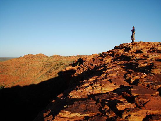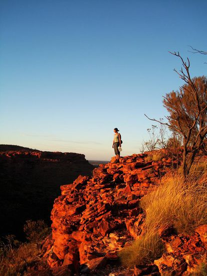 So ging es mit einem fast neuen Georgy los weiter ins Outback. Zuerst holten wir uns die noetigen Infos im Touricenter, sowie die Bewilligung um durch Aborigini-land zu fahren und dann konnte es Richtung Kings Canyon losgehen. Auf dem Weg dorthin gab es aber schon so viele Sehenswuerdigkeiten, dass wir denn ganzen Tag fuer den Namatjira Drive benoetigten. Viele Canyons, Aussichtspunkte und Wasserloecher. Da will man nicht einfach nur so durchbrettern.