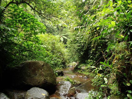 Ein Trek fuehrt durch den Wald bis zum Wasserfall und im Wald sahen wir unsere ersten richtig wilden Affen. Leider waren sie zu schnell und wir kriegten sie nicht aufs Foto .