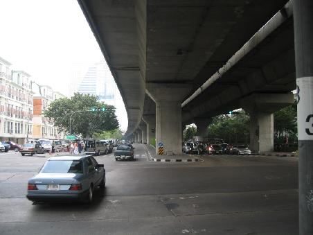 Dies ist eine Geschäftsstraße. Wie sonst auch wo in Bangkok, man merkt aber, dass diese Gegend hier viel Wohlhabender ist. Die Straße selbst ist viel breiter, genauso der Gehsteig. Zuerst ging es unter der Stelzenautobahn hindurch bis ich beim "Silom Plaza Hotel" auch auf die "Skytrainrute", ebenfalls auf Stelzen befindliche Schnellbahn, stieß.