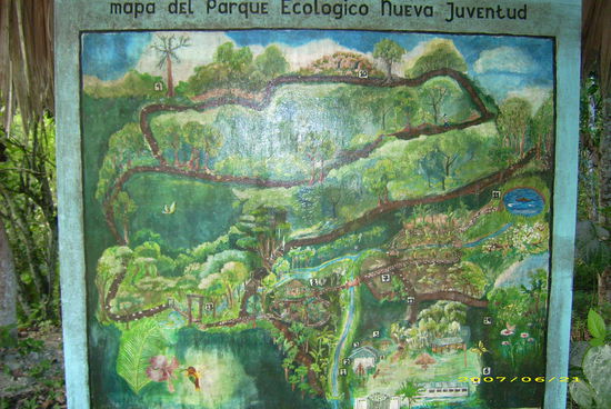 Es gibt einen Teich in dem ein Krokodil geben soll (glaube ich erst wenn ich es sehe), ein Bananenbaumfeld, einen Kraeutergarten und dann richtigen Dschungel - Lianen soweit das Auge reicht und eine kurze Einfuehrung von Mateo.