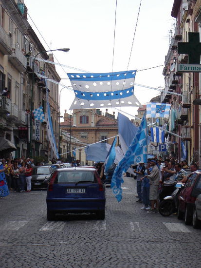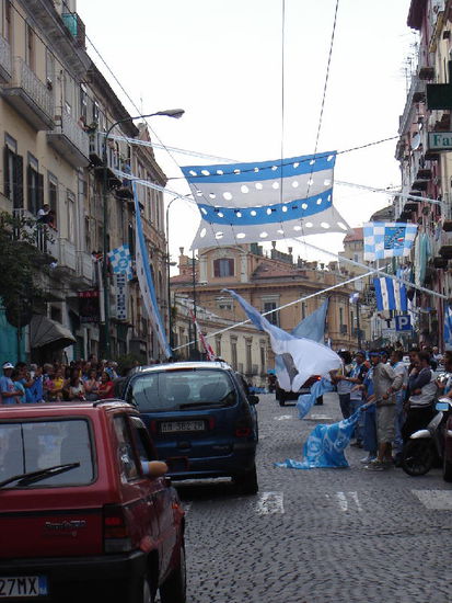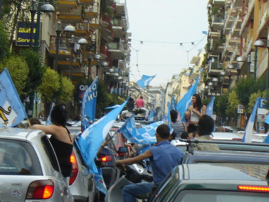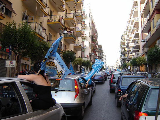 Bis weit in die Nacht hinein fliesst der Verkehr nur mehr zähflüssig. Die Freude des umstehenden Publikums scheint schier grenzenlos! 1987 wurde die SSC Napoli zum ersten und einzigen mal Italienischer Fussballmeister! Dann die Talfahrt und jetzt - ausgerechnet am heutigen Tag der Aufstieg in die Serie A! In der Tat, solche Feiern hatte ich bislang noch nie gesehen!