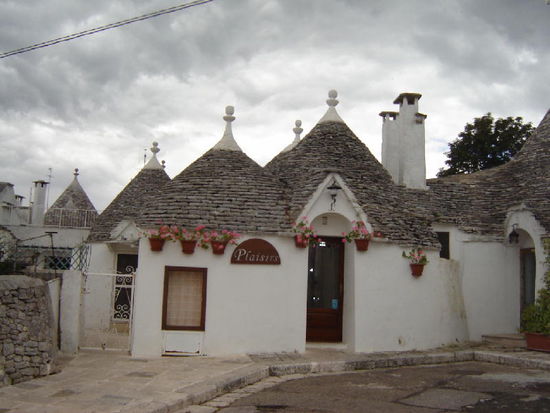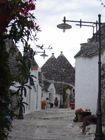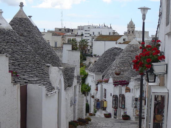 Oder könnte es auch so gewesen sein? Die Bauern bedienten sich des seit der Antike im ganzen Mittelmeerraum verbreiteten Typs einfacher Rundbauten aus aufgeschichteten Steinplatten, die oben zu einem sogenannten unechten Gewölbe zusammengeschoben wurden. Bei grösserem Platzbedarf wurden schlicht mehrere Häuschen miteinander verbunden - wodurch auch die charakteristischen Strassenzüge Alberobellos entstanden.