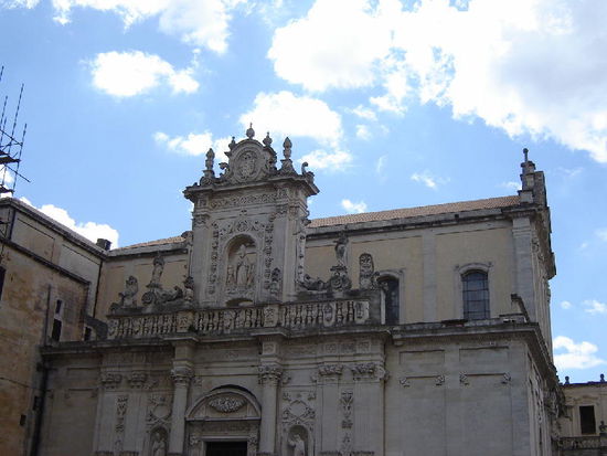 Ein herrliches Ensemble ist es trotzdem, der honigfarbene Tuffstein der Stadt Lecce (84'000 E.) auf dem Absatz des italienischen Stiefels. Zwischen 1550 und 1750 erlebte die Metropole des Salento eine wirtschaftliche und künstlerische Blütezeit. Das "Florenz des Barock" ist immer noch eine wohlhabende Stadt, die dank Ihrer Universität auch eine recht lebhafte Atmosphäre besitzt.
