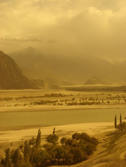 Es freute uns dann schon als sich nach 700km Bergstrasse ein wunerschönes Hochtal auftat. Hier säumen auf 2500m.ü.M riesige Sanddünen die Ufer des Indus.
