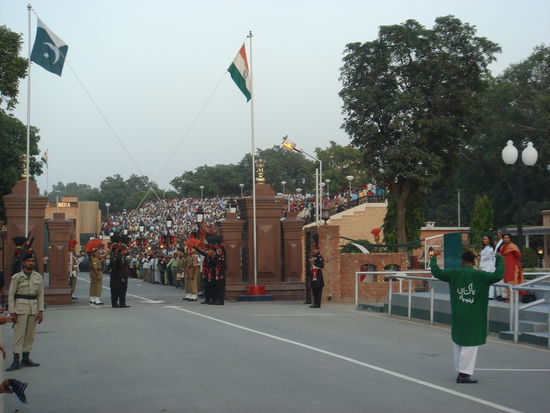 Hunderte von Zuschauern bevoelkern die Tribuenen, wenn die Grenzen geschlossen werden und unterstuetzen ihre Nation lautstark beim militaerischen Zeremoniell. Fuer uns ein Ausdruck der schlechten Beziehungen zwischen Indien und Pakistan...ein jeder Pakistani hat uns davor gewarnt, dass Indien ein "weniger gutes Land" seie.