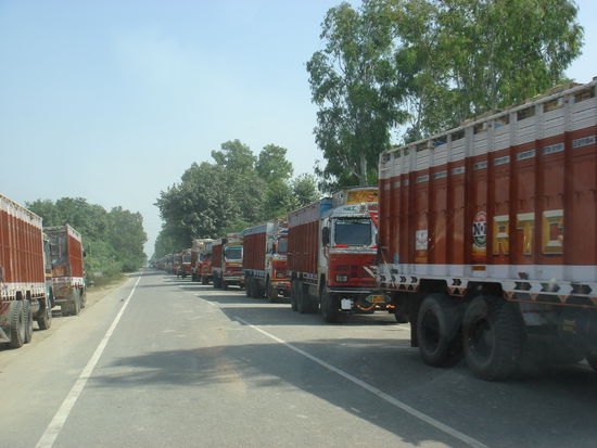 Weil diese Handarbeit unglaublich Zeit tilgt, saeumen die ersten Kilometer Indiens die weniger schoen verziehrten, wartenden Tata-LKW's (ja, die Effizienz ist nicht gerade die Paradedisziplin in Asien)