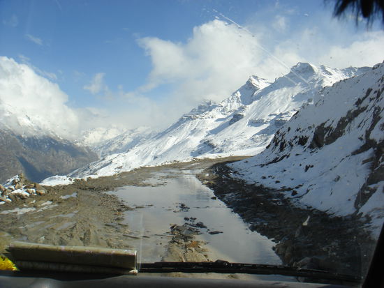 Die Route fuehrt uns zuerst von Manali auf den Rotang-Pass (3995 m.ue.M). Es sieht aus wie in der CH hier, einfach dass alles viel hoeher ist und es ganz viele indische Touristen hat...fast wie in Engelberg!
