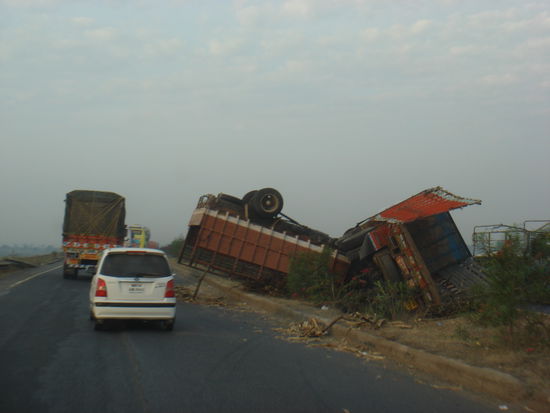 Fuer uns Schweizer ist eine solche Situation nicht verstaendlich. Unter den Overlandern weiss man aber: der sonst so gelassene Inder dreht durch wie ein Reifen im Schnee wenn im Verkehr was schief laeuft. In kuerzester Zeit schart sich ein Mob von 50 Leuten und haemmert wie wild auf die betroffenen Fahrzeuge. Haeufig schreitet die aufgebrachte Menge dann zur Selbstjustiz. So lasen wir kuerzlich in der Zeitung, dass ein unfallverursachender Reisecar kurzerhand in Brand gesteckt wurde.