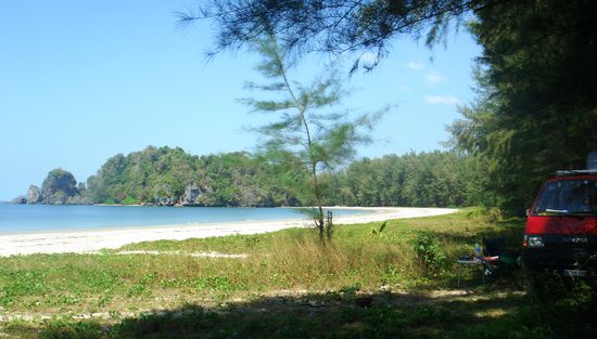Mit den Straenden des Hat Chao Mai Nationalparks erreichten wir das vielgelobte thailaendische Meer und staunten nicht schlecht: ein jeder war ja schon mal da, doch hier wo wir standen, war weit und breit gar keine Menschenseele zu finden! Mitten im Nationalpark bezogen wir direkt am Strand unser Zuhause.
