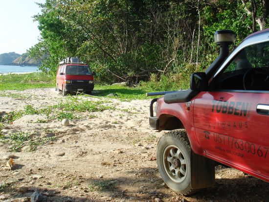 Auch unserem Bus hat's am Strand bestens gefallen: er genoss nach den heissen und engen Tagen im Container die Freiheit des Strandes und vergnuegte sich im Sand.