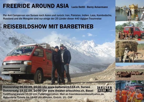 Schickt uns doch ne Mail an freeridearoundasia@yahoo.de um ein Ticket zu reservieren (bis 1945 Uhr abholen). Der Eintritt ist 15 SFr. Wir freuen uns auf Euch und wünschen alles Gute im 2009!!