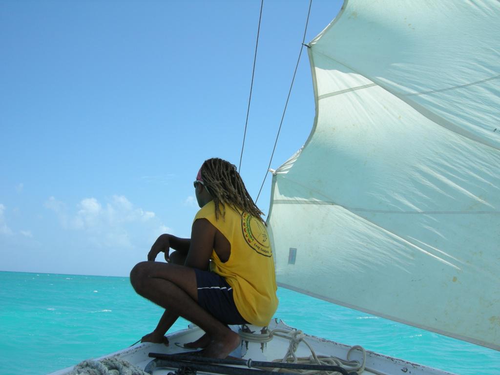 Drei Stunden lang liegen wir auf dem Sonnendeck eingekreisst vom karibischen Meer. Eine leichte Briese macht die Temperaturen angenehm, waehrend Raggaebeats aus den Boxen droehnen. Mario, der Co-Captain sitzt am Ruder und pafft einen Joint. Auch auf dem "Raggaking" ist ein Schriftzug mit "GO SLOW" zu finden. Dann reisst das Segel und wir tuckern mit Hilfsmotor zu einer winzigen Insel. "When you break down in Belize", meint Mario "at least you break down in a very nice place." Recht hat er! Eine Stunde lang blicken wir auf den Ozean und gehen Schwimmen. Dice, Mario und Rafael - unsere Crew - tun es uns gleich. Anstallten etwas zu reparieren oder organisieren machen sie jedenfalls nicht.