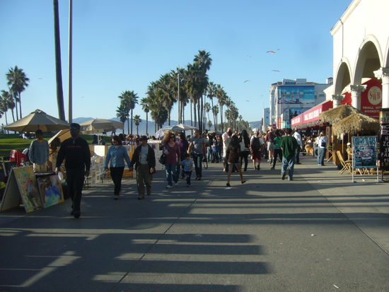 Venice Beach ist eine eigene kleine Stadt im Stadtkomplex von L.A. und einfach nur total verrueckt.Man sieht Menschen mit Schlangen umd en Hals oder papageien auf der Schulter die Promendae entlanglaufen, Muskelbepackte Moechte-gern Bodybuilder die in aller Oeffentlichkeit tarinieren; braungebrannte Jungs, die oben ohne mit dem Fahrrad durch die Stadt fahren und dabei ihr Surfbrett unter'm Arm tragen sowie kleine Kinder, die auf Raedern fahren, die Mini-Harleys zum verwechseln ahenlich sehen...Sehen und gesehen werden ist hier das Motto!!!