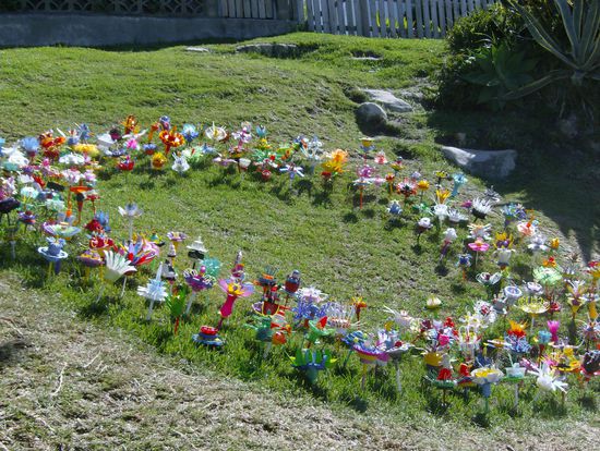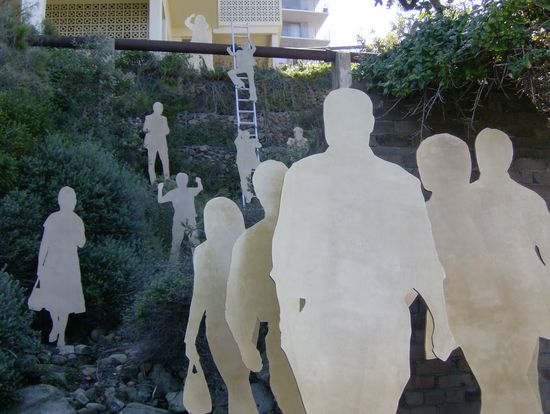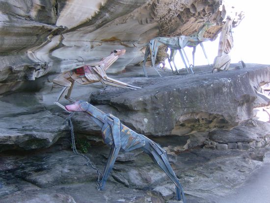 Solche Fitness-Stationen findet man den ganzen Kuestenwalk, der eine beliebte Joggingstrecke ist, entlang. Die Haende sind Kunst