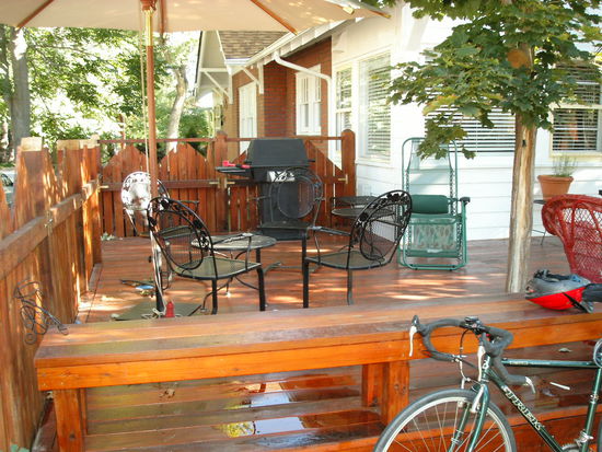Es ist sehr heiß (über 30 Grad C) und als uns Jan um 16.00 Uhr am Busbahnhof mit dem Auto abholt, sind wir ziemlich k.o. Auf dem Rückweg fahren wir noch am Reifenladen vorbei. Jan hatte gestern einen platten Reifen an ihrem Auto. Der Pannenservice kam sogar noch um 22.00 Uhr, um den Reservereifen aufzuziehen (umsonst! - Audi-Service!). Nach einer kurzen Pause auf der Terasse zeigt uns Ken die umliegenden Berge mit dem Jeeb. Danach kaufen wir Bier in einem riesigen Liquor-Store, wo man sogar deutschen Sekt und chinesisches Bier kaufen kann. Er zeigt uns auch das Haus, das die beiden gekauft haben, jetzt renovieren lassen und danach (mit Gewinn) verkaufen werden. Einfach toll. Das Haus ist riesig, noch größer als ihr eigenes, auch im viktorianischen Stil. Wahrscheinlich wird das Haus mal über 2 Mio. $ kosten, leider zu teuer für uns.... Ein Kellerraum nur zum Fernsehen, ein Schlafzimmer mit eigenem Kamin, Badezimmer und Ankleidezimmer und, und, und. Boulder ist wirklich eine wunderschöne Stadt und wir würden sofort umziehen! Abendessen gibt es auf der Terasse. Es wird gegrillt. Fisch, Maccaroni mit Käse und Maiskolben. Es ist immernoch schön warm abends.
