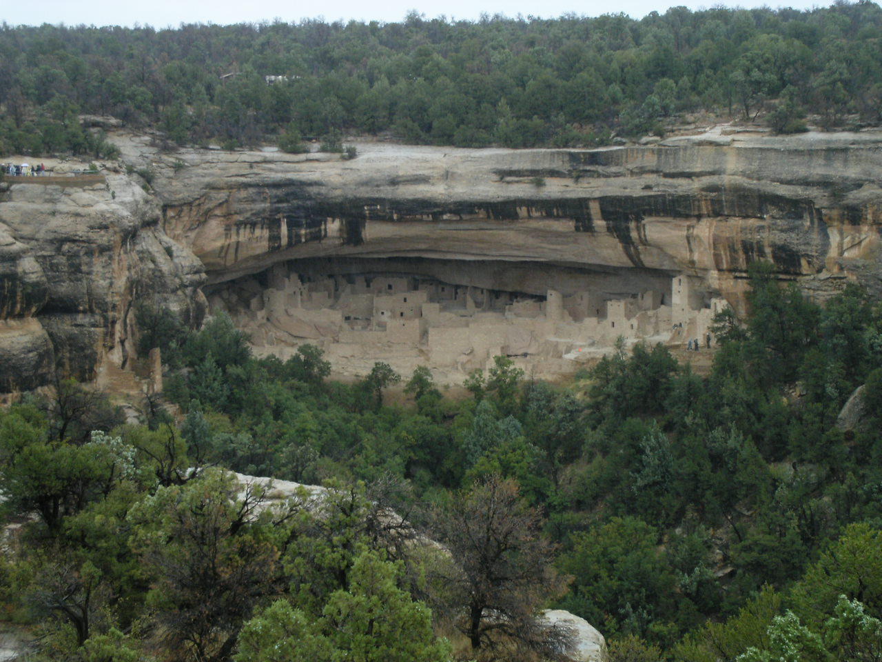 Eine geführte Tour möchte Thomas nicht machen. Außerdem haben wir nur wenig Benzin im Tank, daher entscheiden wir uns für die Mesa Loop. Das sind vom Visitor Center 10 Meilen. Im immernoch ströhmenden Regen sehen wir uns die zuerst entstandenen Indiander-Behausungen an, bzw. das was von ihnen übrig geblieben ist. Ein paar Kuhlen im Boden und Lehmziegelumrisse. Richtige Wanderwege werden nicht angeboten. Bis zu den Hütten sind es jeweils nur ein paar Meter. Dann gibt es noch ein paar Ausblicke in den Canyon auf die Klippenstädte.