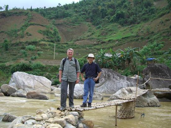Als wir endlich den Fluss erreicht haben, Pause in einem einfachen Rasthaus. Es regnet wieder. Die große Chi macht sich in der Küche zu schaffen, um unser Essen zuzubereiten, die kleine Chi hockt mit Vu draußen unterm Schirm. Sieht erbärmlich aus. Ich gehe hinaus und versuche, die beiden herein zu holen. No. Ich bestehe darauf. Sie trauen sich bis zum Eingang, wo auch die H'Mong-Frauen warten. Zum Tisch zu kommen, trauen sie sich nicht. Dauert nicht lange und ich sehe den Grund. Die Wirtin will die Kleinen verscheuchen. The girls belong to me!!! Erstaunlicherweise wirkt das, und sie lässt die beiden in Frieden. Offensichtlich dürfen Kinder nicht nur in keine Hotels, sondern auch in keine Rasthäuser. Angst vorm Betteln kann es nicht sein, H'Mongs betteln nicht. Man hat sogar Mühe, ihnen Trinkgeld aufzudrängen. Aber sie wollen eben was verkaufen. Wird nicht erwünscht sein.