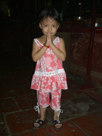 Ein kleines Mädchen hat es mir angetan, ich will es fotografieren. Fotografiert mal in einem finsteren Tempel ein Kind ohne Blitz. Haha! Die Mutter erkennt meine Enttäuschung, stellt die Kleine vor mich hin, faltet ihr die Händchen von neuem - und perfekt! Süß. Schade, dass Ihr die Räucherstäbchen nicht riechen könnt, die Kerzen nicht flackern seht!