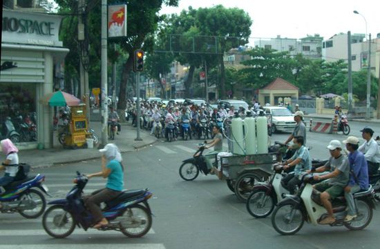 Tüüüüt. Tüt Tüt. Tüt Tüt Tüt. Tüüüüüüüt. Tatüüü. Braune Augen, Tücher, Masken. Ohrenbetäubender Lärm. Weit weit weg von der Gefahr, in einem großen klimatisierten Reisebus. Neugierige Blicke hinaus, ebensolche herein. Saigon. Das ist es also. Mopeds.