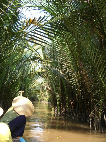 Besorgt blicke ich vom schmalen Boot, wenige Zentimeter über dem Wasser, ins gelbe Wasser des Mekongflusses. Jederzeit erwarte ich, dass ein Krokodil nach mir schnappt. Habe genug Filme gesehen. Die Vögel schreien. Ist nicht immer ein Krokodil in der Nähe, wenn die Vögel schreien? Mit regelmäßigen Schlägen tauchen die Paddel der beiden Bootsführerinnen ins Wasser. Die sind im Alter der Pensionisten in unserer Gruppe. Eigentlich sollten wir SIE rudern, aber ich denke, das würde ein wenig erfrischendes Bad bringen. Palmen, Mangroven, hin und wieder blitzt ein Sonnenstrahl durchs Blätterdach, während wir durch den tropischen Tunnel gleiten.
