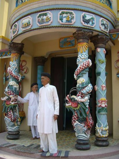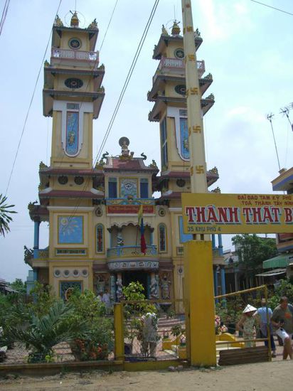 Heute steht das Mekongdelta auf dem Programm. Einen Tempel der bizarren Cao Dai-Sekte mussten wir unterwegs noch besichtigen. Sehr bunt wie die Lehre selbst, jedenfalls jedoch angenehm kühl, wozu schon allein das Ausziehen des Schuhwerks beiträgt.